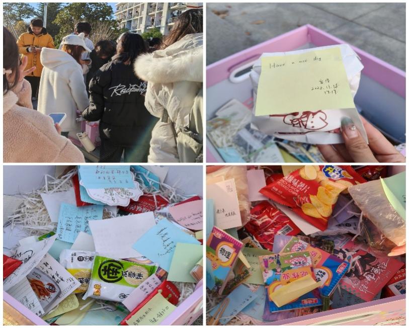 活动期间,大家将自己精心准备的礼物与写满祝福语的卡片投入箱子中,并随机与他人进行交换。对参与者而言,此次活动使他们在未知的惊喜中收获他人的心意,同时释放自身的感恩之情,丰富精神体验。对学校氛围而言,该活动通过个体间的心意交换,营造良好的社交环境,为快节奏生活注入温情。