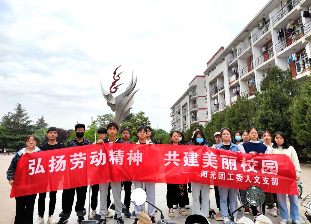 为了更好地弘扬劳动精神,践行青年责任,鼓励同学们积极投身到建设美丽校园的行动中,打造干净整洁的生活和学习环境,阳光团工委人文学院支部于2022年4月30日开展了以“弘扬劳动精神,共建美丽校园”为主题的校园清洁志愿服务活动。
