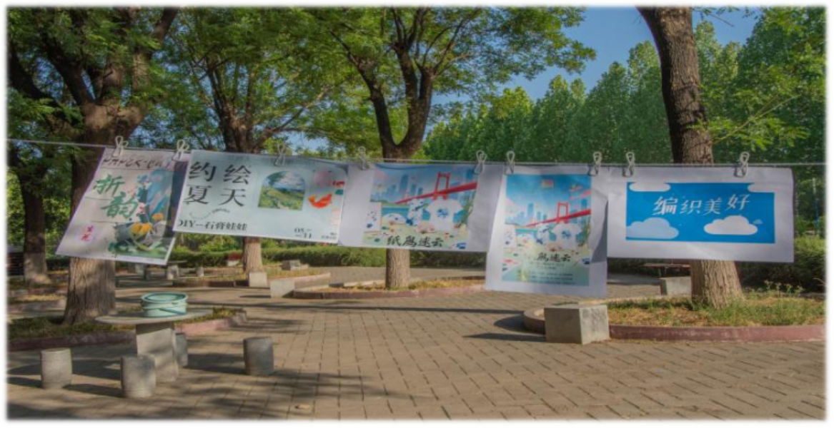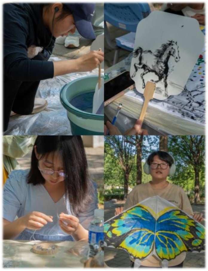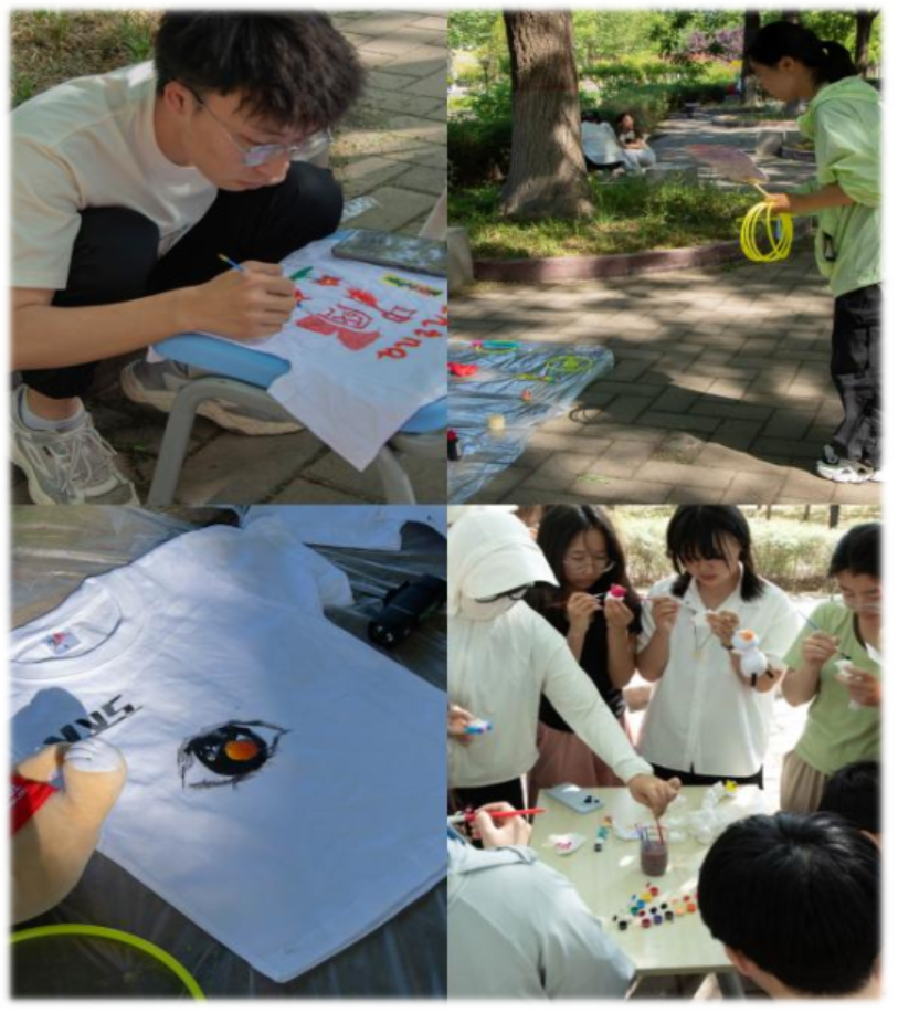 作为“巧手制艺·妙圈套礼”活动的第二阶段,本次活动设置了四大手工创作板块:“扇·衣·鸢DIY艺术工作坊”、“折韵生花”、“约绘夏天”和“编制美好”。参与者可自由选择任意板块,发挥创意制作专属手工艺品。在“扇·衣·鸢DIY艺术工作坊”区域,同学们以空白团扇、短袖、风筝为画布,挥毫泼墨,创作出风格各异的作品,既有传统水墨的雅致,也有现代涂鸦的活力;“折韵生花”板块则吸引了众多手工爱好者,大家用彩纸折叠出栩栩如生的花朵,一朵朵“纸艺花”在阳光下绽放;“约绘夏天”区域里,同学们用画笔记录夏日美好,创作出充满童趣的石膏作品;在“编制美好”区域,丝线在同学们指尖穿梭,琉璃珠子流光溢彩,串成精美的手链、挂饰等小物件。一件件作品的诞生,展现了同学们的艺术才华与耐心细致的工匠精神。