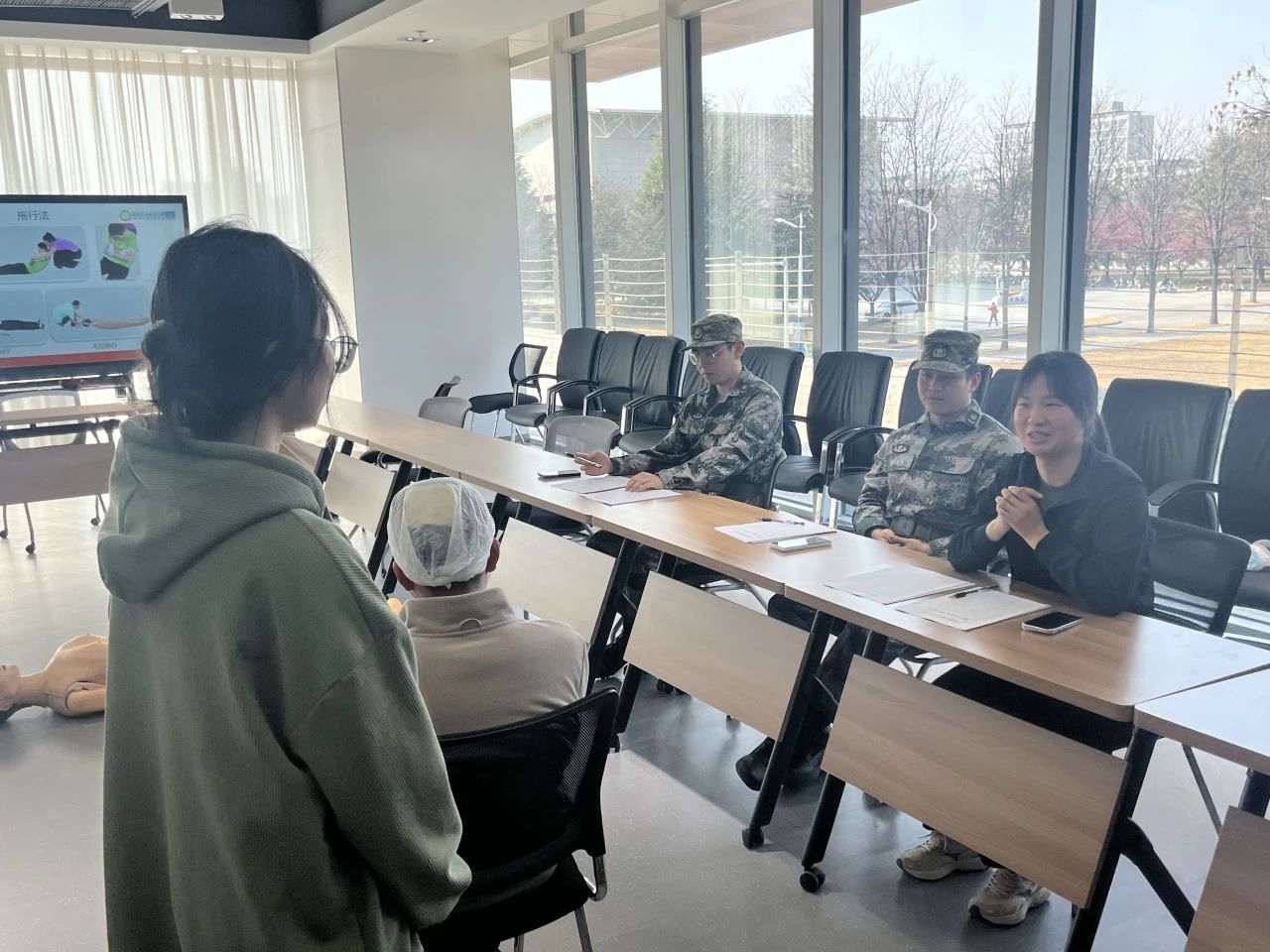 在面试实训现场,教员亲自示范指导,系统开展了急救技能全流程演练。从创伤救护到心肺复苏,每个环节都呈现得专业严谨:伤口清创消毒的操作规范、绷带包扎的力度把控,胸外按压的深度频率与人工呼吸的节奏配合,每一个技术细节都被清晰拆解、逐项示范。通过理论阐释与动作示范的深度融合,不仅让面试者直观掌握技术要领,更在沉浸式学习中有效提升了急救实操的自信心。