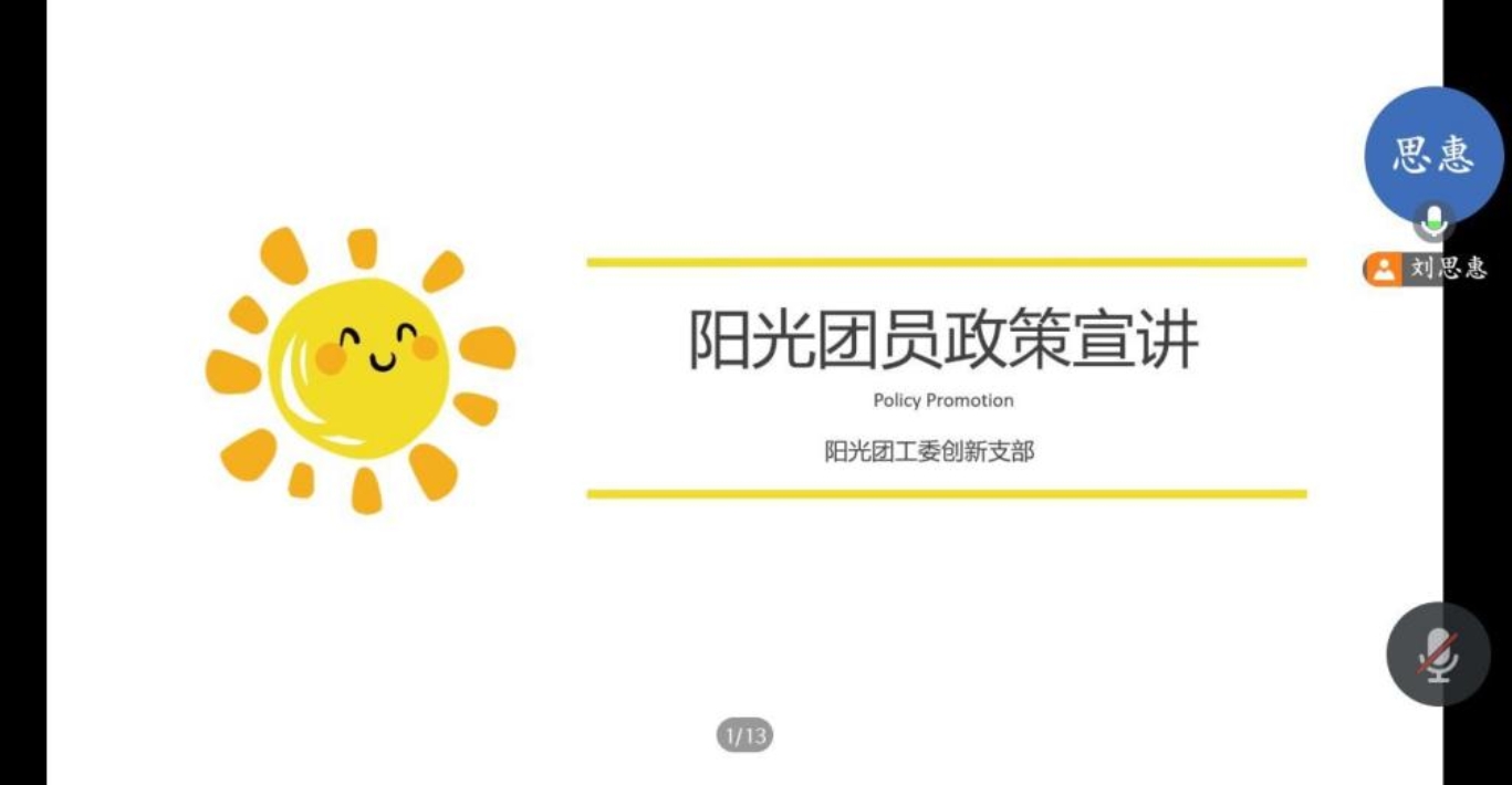 10月12日晚七点半,“阳光团员政策宣讲活动”于线上展开。本次活动由阳光团工委创新支部举办,由负责人刘思惠担任宣讲人,旨在加强阳光团员对资助育人政策的了解,并进一步激发他们的责任感和使命感,引导他们更好地履行阳光团员的义务和职责。