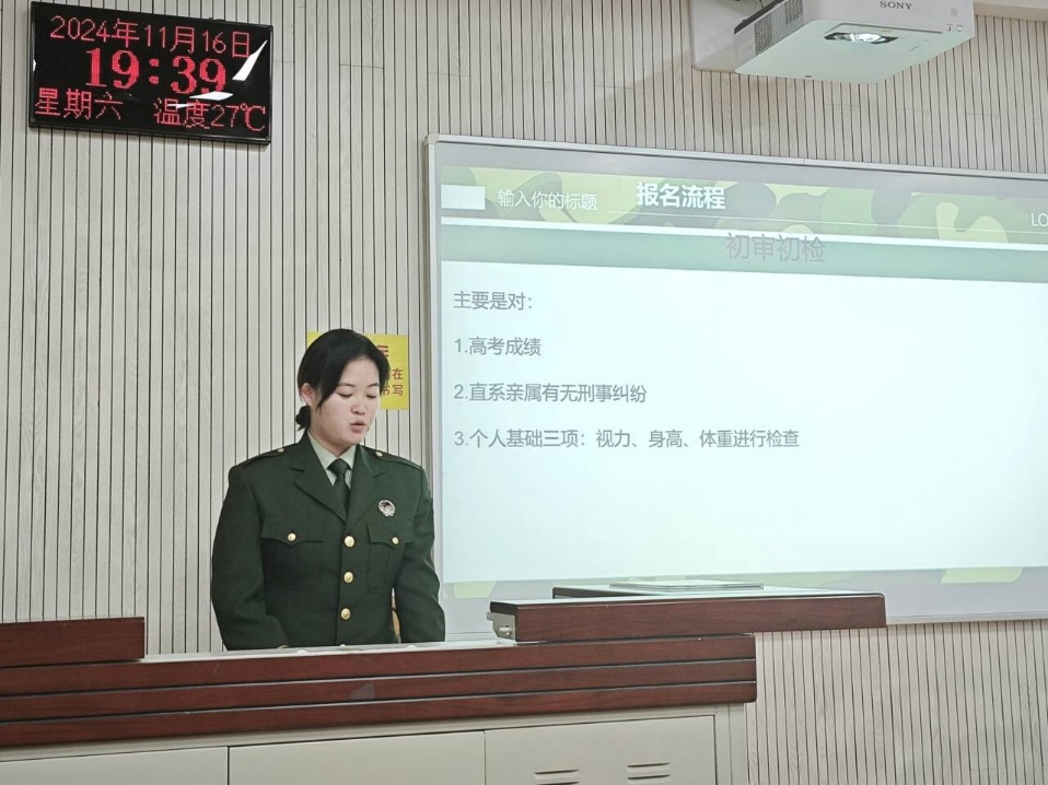 宣讲活动详细介绍报名流程初审初检主要有三项:高考成绩,政审和体检。帮助学生全面了解参军路径,为他们的军旅生涯做好准备。