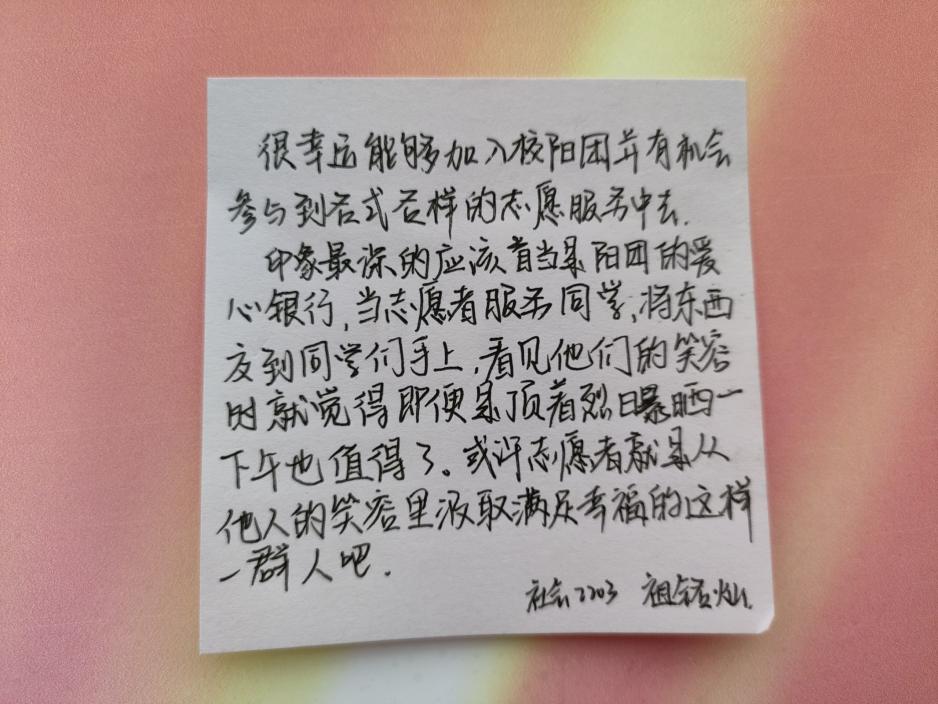 活动伊始,工作人员向同学们介绍志愿服务相关知识,传递志愿服务的理念和意义,鼓励大家分享自己的志愿故事。现场同学积极参与,在小纸条上写下自己的志愿故事与感受。活动结束后,工作人员将纸条整理收集,对参与活动人员进行登记和统计。本次活动中,工作人员细心负责,鼓励和激发更多同学关注志愿活动。同时,此次活动也激发了同学们参与志愿服务的热情,并使同学们从中得到收获和成长。