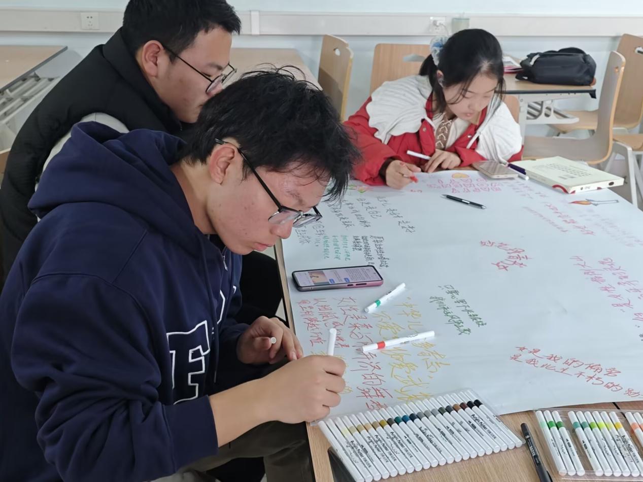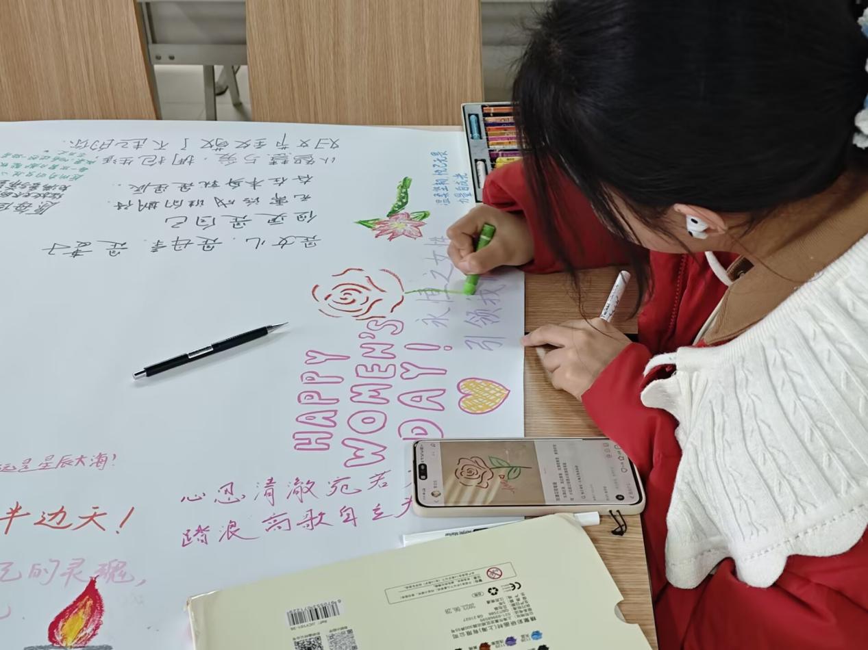 同学们活力四射,热情高涨,心怀尊重与敬仰,提笔写下对女性力量的赞语,或是绘制出代表女性精神的美丽图案。整个活动现场气氛热烈,充满活力。画纸上色彩缤纷,一段段饱含深情的赞美之词,折射出同学们对活动的认真态度和对女性的关怀。活动进入高潮阶段。此时,大多数同学的作品都有了显著的进展。同学们竞相抒怀,现场充满了浓厚的艺术氛围和温暖的情感交流。活动接近尾声。同学们陆续完成自己的作品,“柔肩担重任,巾帼亦英雄”、“女是我的偏旁,是我此生不朽的勋章”...画纸上绚丽的赞语可谓情感真挚、文采飞扬,这些作品不仅体现了同学们的才华,更传递出对女性的关心和尊重,营造了和谐的校园氛围。