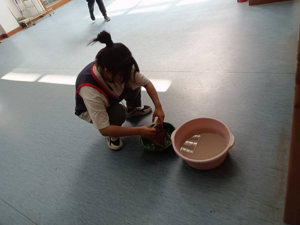 本次清扫活动有二十余人,来自不同的班级,但大家分工明确,配合默契,有的负责打水,有的负责清洗脏抹布,有的负责擦拭台面。志愿者们忙碌的身影在图书馆中不停穿梭,轻缓的脚步落在地面上不发出一丝响动,手中的抹布拂过台面,清扫掉扰人的灰尘,盆中黑黝黝的洗抹布水倒映着的整洁干净台面无声诉说着阳光团员们此次图书馆清扫之旅的努力与成果。