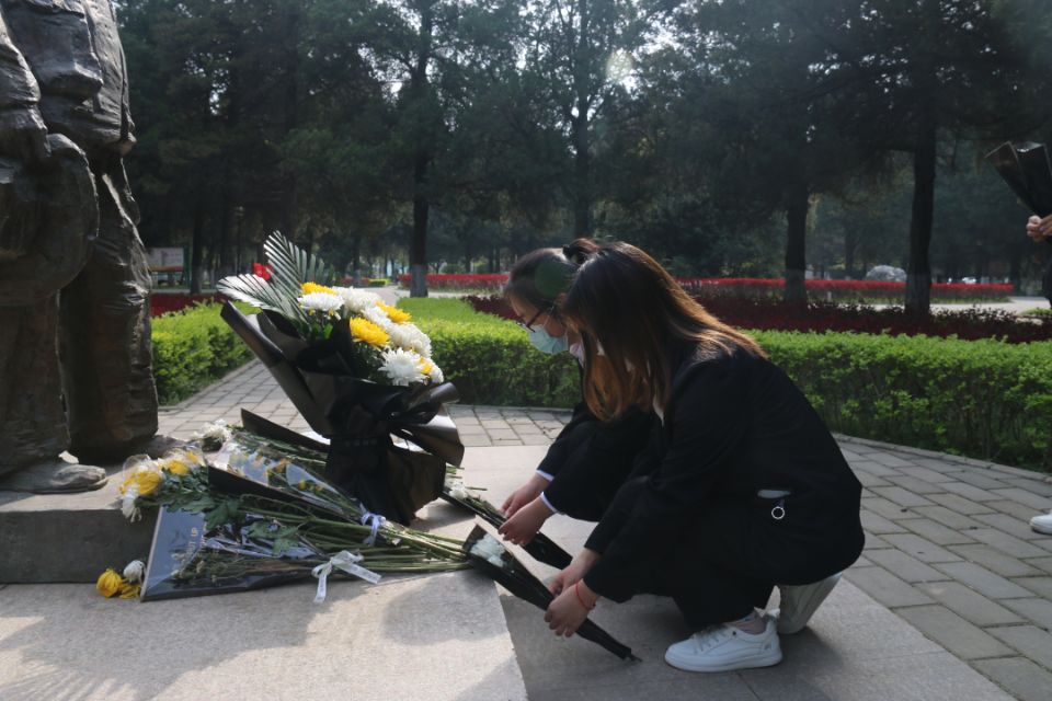 同学们着深色衣裳,列队于三号教学楼前,精神抖擞,面容庄重。学生代表佟心怡发言道,“时间在流逝,时代在进步,然而革命前辈们的精神,永垂不朽!先烈回眸应笑慰,擎旗自有后来人,我们要铭记革命先辈,克服困难,拼搏奋斗,努力开拓美好幸福的未来。”其所言字字铿锵,令在场每个人心绪难平。带着这夹杂着思念与力量的情绪,同学们高举右手,握紧拳头,以青春的名义,面对国旗,向革命先辈庄严宣誓:我们将继承先辈们的遗志, 人民为先,祖国至上。发扬勇往直前,无坚不摧的革命精神,拋弃懒散与柔弱,告别散漫与消极;以坚强的意志、严明的纪律、崭新的面貌、积极的状态,投入到学习生活中去;以我壮志豪情,创造崭新未来;以我火红青春,建设锦绣中华! 誓言还在心中回荡,望着这长眠在此的革命先辈,同学们纷纷低头默哀,心中充斥着无限悲痛与思念。思念无声,热泪迎之。我们会记得每一个曾鲜活地出现在历史画卷里的先辈,因为有我们的记忆与爱,他们便从未离开。无限的悲哀,化作坚定的信念,美好的心愿,编成洁白的花环,我们以低头传递哀思,用花以飨逝者,致敬先辈,告慰英魂。