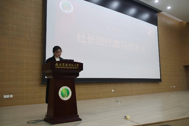 随后,社长团代表发表讲话。首先社长团代表马莹以“西农唐爱,风雨同在”的真挚宣言,唤起社团成员对彼此陪伴与共同成长的温暖回忆,凝聚全体社员的情感认同。紧接社长团代表李福强就上学期社团工作进行全面回顾与总结。他系统地梳理社团在历次活动以及在“家文化建设”和“成员能力培养”方面的实际进展中所取得的成果,并坦率地指出工作中存在的不足之处,体现社团在反思中持续成长、在挑战中不断优化的坚定决心。